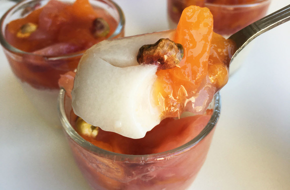 Une fois bien fondantes, retirez les pêches rôties du feu. Lorsque les panna cotta sont fermes, versez alors par dessus généreusement les pêches rôties.