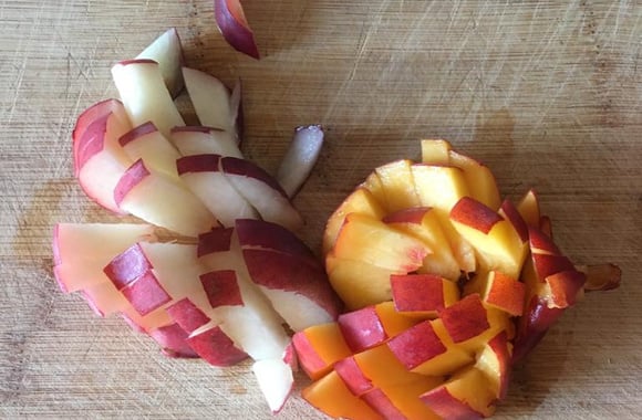 Pendant ce temps, dénoyautez et coupez en petits morceaux les pêches, puis faites-les revenir dans une poêle avec 3 cuillères à soupe d’eau et 1 cuillère à soupe de sirop d’agave à feu moyen.