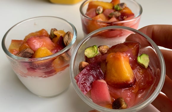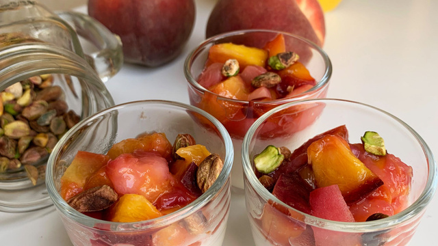 Bonjour à tous !! J'avais envie pour cet été de créer un dessert rafraîchissant, léger, avec peu d'ingrédients et prêt en un temps express !! J'ai donc créer cette recette vegan de Panna Cotta aux pêches rôties. Tout d'abord pour profiter des fruits de saison !! Et n'étant pas très fan des produits laitiers animales (peu digeste) j'ai opté pour du lait végétal qui fonctionne à merveille ! La panna cotta se tient parfaitement, est healthy et super fraîche !! Pour encore plus de gourmandise, vous pouvez saupoudrer votre panna cotta avec de quelques pistaches ou de biscuit ;)