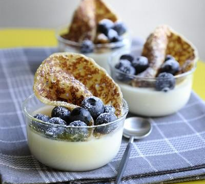 Déposez les morceaux de crêpes dans la poêle et laissez-les cuire pour qu'elles caramélisent. Déposez sur la pannacotta, ajoutez les myrtilles sur le dessus, saupoudrez d'un peu de sucre glace et servez sans attendre avec du cidre LOÏC RAISON DOUX.