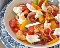 Ensuite, ajoutez les tomates confites, le poivron, la mozzarella, l'oignon émincé et le basilic ciselé. Ajoutez un trait d'huile d'olive, et servez immédiatement.