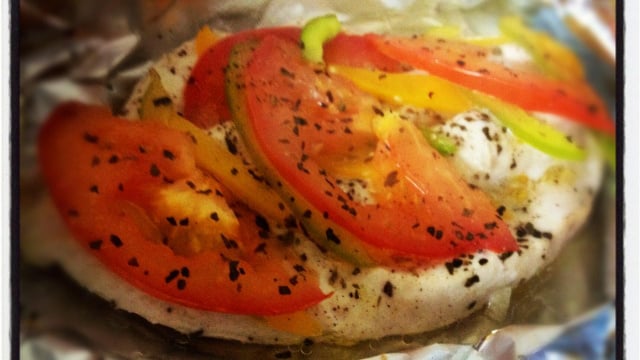 Disposer votre filet de poulet dans un papier d'aluminium, mettre un peu de basilic, disposer vos poivrons et tomates par dessus (comme sur la photo) mettre une cuillère d'huile d'olive sur tout cela.