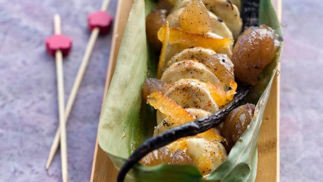 Réaliser des caissettes de feuilles de bananier (rectangle de 30 x 15 cm) tenues par une pique en bois de chaque côté.
