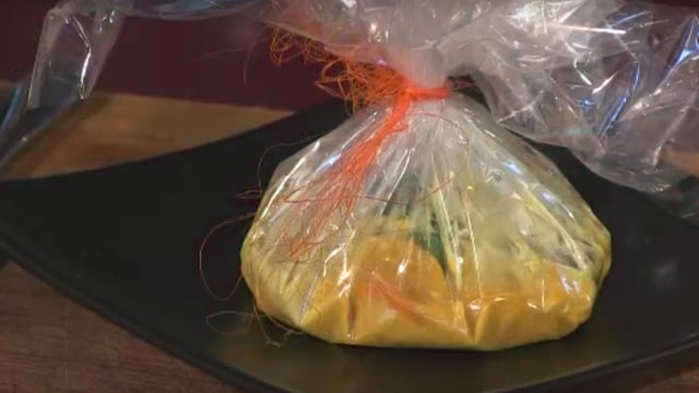Dans un papier film Carta Fata, mettez la moitié des légumes, ajoutez le pavé de cabillaud. Dans un petit bol, versez 75 cl de crème fraîche épaisse, ajoutez 1 c à s de moutarde et mélangez. Versez 2 à 3 c à s de cette préparation sur le poisson, ajoutez du romarin et du persil. Fermez la papillote avec du fil de cuisine ou du raphia puis faites cuire 15 minutes au four à 180°C.
