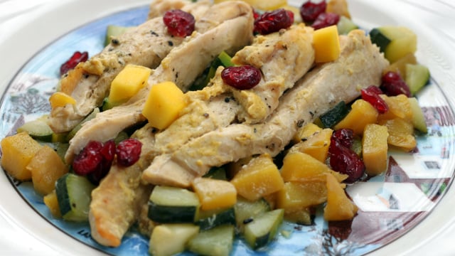 Éplucher les courgettes en laissant la peau 1 fois sur 2 et les couper en dés. Ciseler les 4 échalotes. Éplucher la mangue et la couper en dés (jeter le noyau).