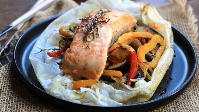 Préparez 4 carrés de papier sulfurisé et 4 carrés de papier aluminium. Mettez au milieu de chaque carré de papier sulfurisé un peu de légumes cuits puis posez pardessus un pavé de saumon. Salez et poivrez le poisson, arrosez-le d'une cuillère à soupe d'huile d'olive et déposez une petite branche de thym pardessus. Fermez le papier sulfurisé pour obtenir une papillote puis enroulez cette papillote de papier aluminium. Faites pareil avec le reste des ingrédients.