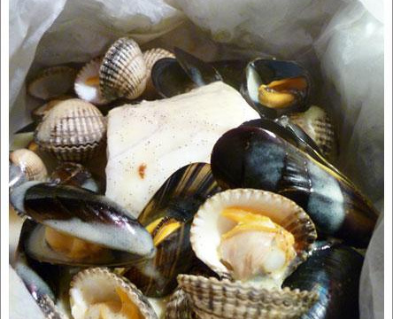 Dans un papier sulfurisé doublé de papier alu (l'aluminium à l'extérieur) déposer le poisson et les coquillages avec une noix de beurre vanillé et refermer hermétiquement. Réserver le reste du beurre de vanille au frigo.