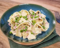 Les "pappardelle" sont des pâtes fraîches aux oeufs italiennes, comme des larges tagliatelles. Elles sont faciles et rapides à réaliser maison, et grâce à notre technique vous pourrez les réaliser sans besoin d'un laminoir pour les découper. Une fois cuites, vous pouvez assaisonner les pappardelle avec la sauce de votre choix. Nous vous proposons notre sauce gourmande super rapide, à base de crème, jambon et petits pois.