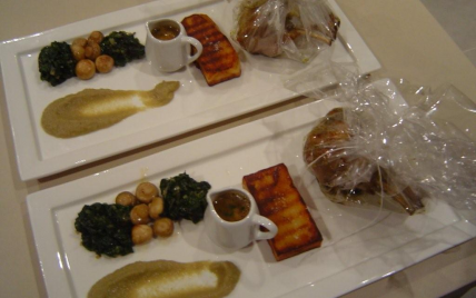 Une selle d'agneau en cuisson douce dans sa papilotte transparante, bien rosé et à peinte assaisonné de za'atar. Pour lui tenir compagnie, des saveurs du sud avec une purée d'aubergines et des pommes de terres grillées à la graisse d'oie. Des petits champignons et des épinards bien relevés terminent cette sympatique bande de copains. La sauce, une simple réduction de fond d'agneau, assaisonné et monté au beurre.