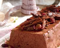 Le lendemain, retourner le parfait au chocolat sur un plateau, démouler et décorer avec des copeaux de chocolat et des cranberries.