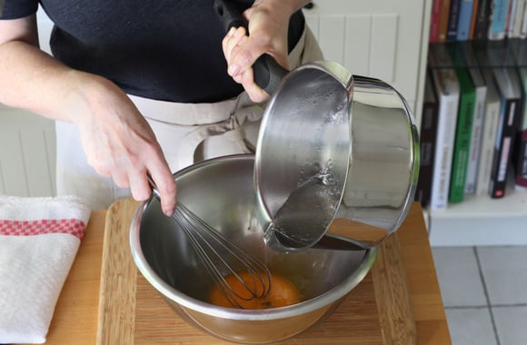 2Versez le sirop à 118°C sur les jaunes, tout en fouettant.