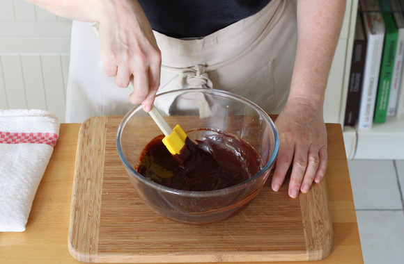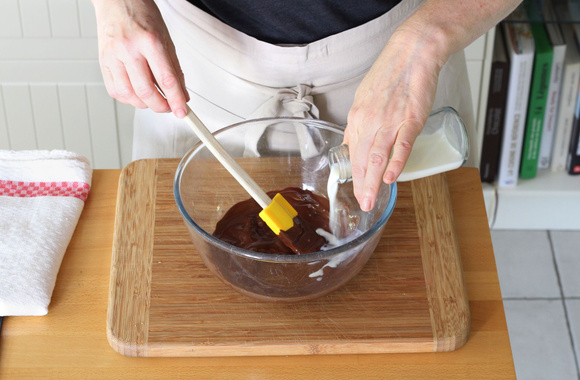 8Cassez le chocolat dans un bol puis faites-le fondre. Faites chauffer le lait puis versez-le sur le chocolat fondu.