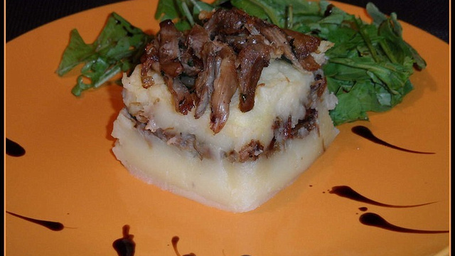 Dans un cercle ou un plat à gratin, mettez une couche de purée, une couche de confit, finir avec la purée et garnir avec un peu de chair de confit, mettez à cuir 25min.