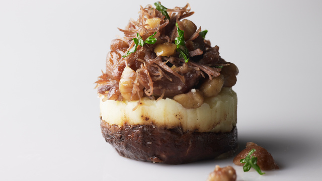 Nettoyer les champignons, réserver les chapeaux et hacher grossièrement le reste.Faire revenir à la poêle ce hachis avec les chapeaux jusqu'à coloration. Ater la peau des cuisses de canard, émietter la chair et la mélanger avec les marrons entiers et les cèpes hachés.Ajouter le persil et le piment d'Espelette. - 3Dressage