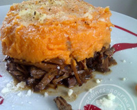 A l'aide de cercle de présentation, dans chaque assiette, mettre plusieurs cuillères d'effiloché de boeuf, puis de la purée de patate douce. Poussez à l'aide du poussoir. Réserver au chaud au four.