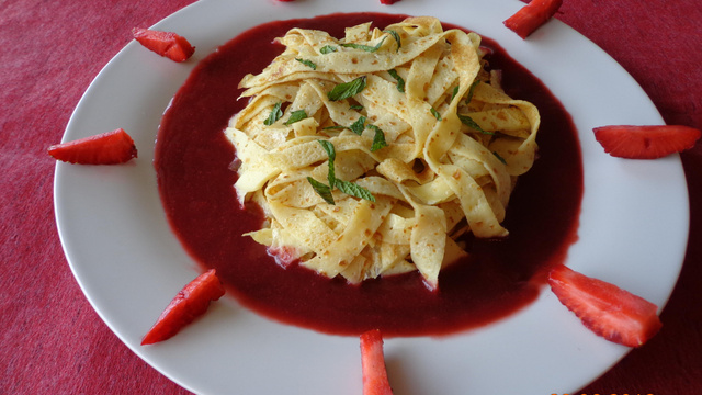 Les pâtes ne sont pas des tagliatelles mais des lanières de crêpes et la bolognaise n'est autre que la soupe de fraises Andros, recette simplissime, idéale pour un goûter d'anniversaire.