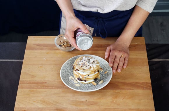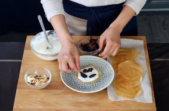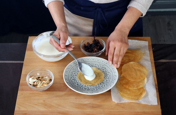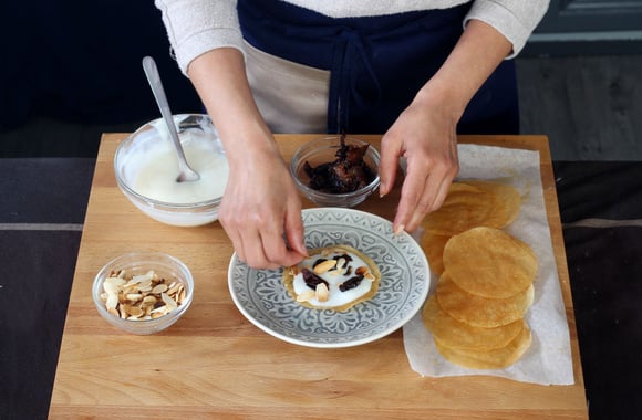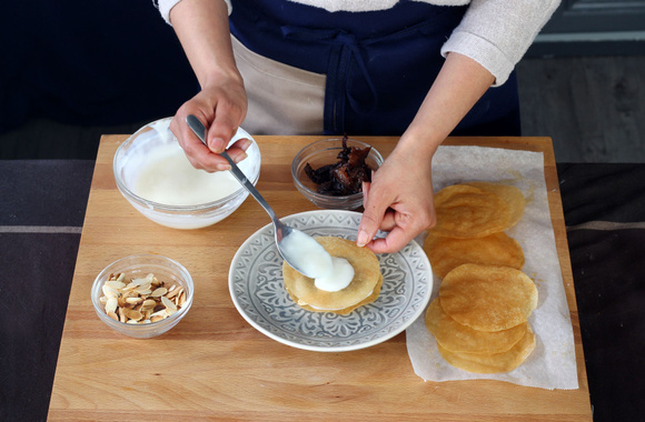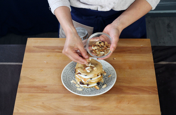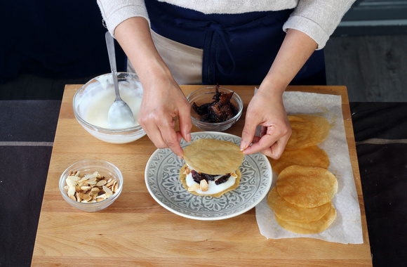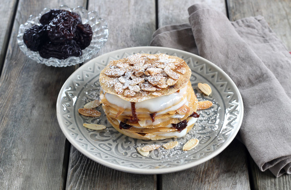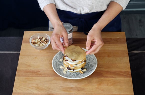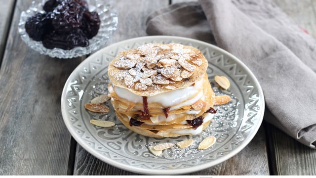 11Ajoutez une nouvelle cuillérée de crème de lait, les dés de pruneaux, des amandes éffilées, couvrez avec un nouveau cercle de brick croustillant et procédez de la même manière en réalisant 4 pastillas d'environs 8 étages chacune.