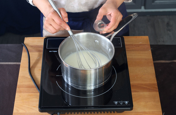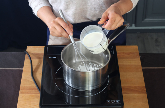 3Dans une casserole, délayez la maïzena et le sucre avec un peu de lait froid, puis versez progressivement le reste du lait en remuant. Amenez doucement à ébullition et laissez cuire 2 minutes, sans cesser de mélanger.