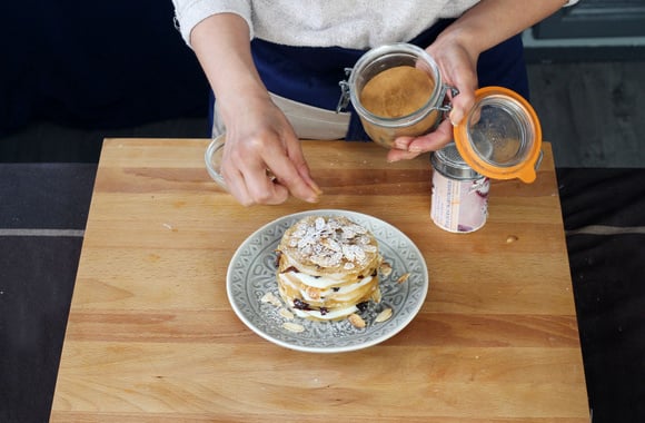 7Au moment de servir, montez les pastillas en alternant les couches: une feuille de brick croustillante, une belle cuillérée de crème de lait.