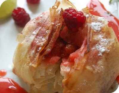 Pendant ce temps, préparer les feuilles de brick pour la pastilla . Badigeonner au beurre fondu les feuilles et superposer 2 feuilles en intercalant de la cannelle en poudre.Remplir les feuilles de brick de la préparation en y ajoutant quelques framboises. Refermer et enfourner à four chaud (180 °C) pendant 10 mn.