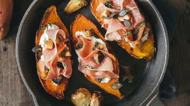 Lorsque les patates douces sont cuites, ouvrez-les en deux en gardant la peux. Garnissez avec de la crème de chèvre, des champignons et des bandes de jambon cru Aoste. Arrosez d’un filet d’huile d’olive et de quelques feuilles de thym.