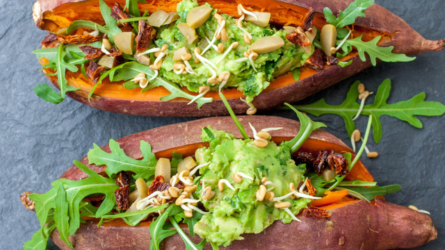 Dans un bol, écraser et mélanger l'avocat avec le cumin, la coriandre hachée et le jus de citron, saler et poivrer. Couper les patates douces en deux, répartissez la mâche, le mélange à l'avocat, les graines germées et les tomates séchées. Servir de suite.