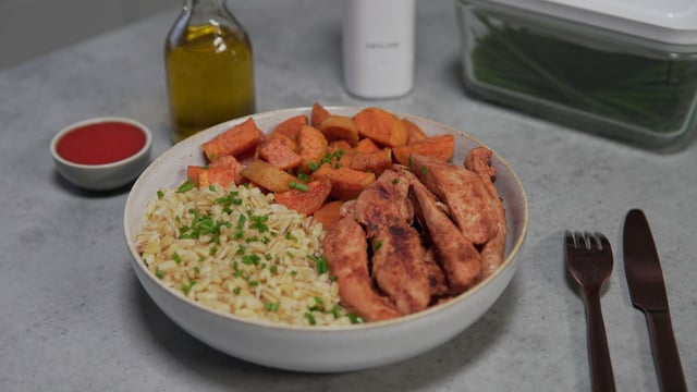 Servez le poulet avec les patates douces et le blé. Parsemez avec la ciboulette ciselée et un peu de sauce pimentée type sriracha.