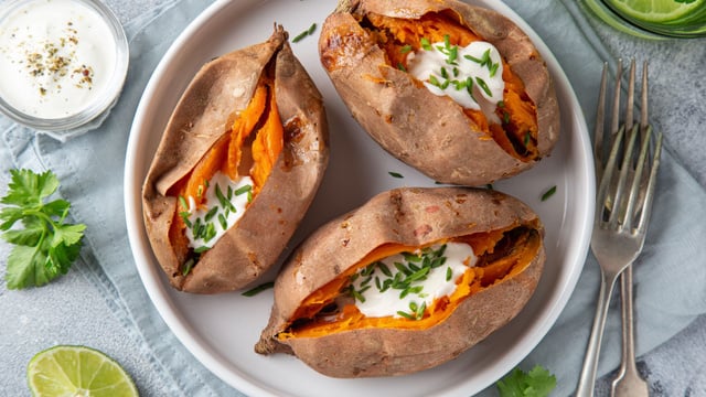 Quand les patates douces sont cuites, fendez-les puis servez-les avec la sauce au yaourt, le citron vert coupé en quartiers et la ciboulette ciselée.