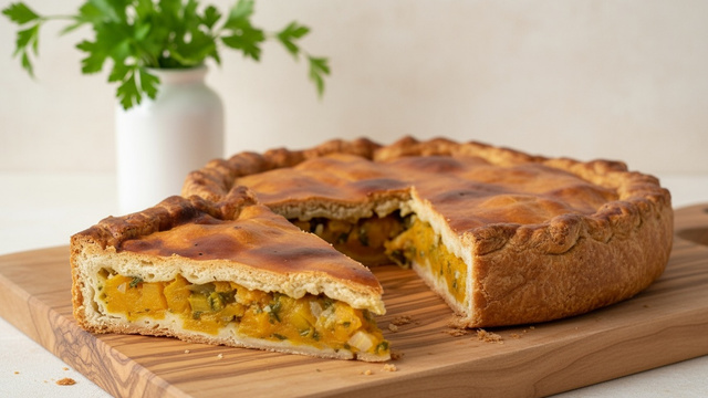 Recette du Berry, cette tourte contient de la citrouille, des oignons et du persil. C'est un coeur moelleux dans une croûte dorée et croustillante, traditionnellement en pâte brisée. Un vrai régal pour les amateurs de citrouille !