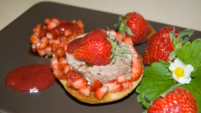 Détailler 50 g de fraises en brunoise et les assaisonner avec le vinaigre balsamique.