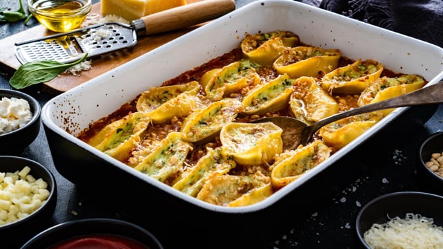 Déposer les pâtes Conchiglioni dans un plat allant au four. Verser la sauce et saupoudrer de gruyère ou de parmesan. Enfourner pour 15 min, four préchauffer à 200°C. Servir aussitôt.