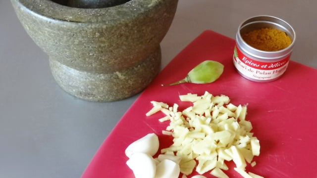 Réalisation d'une pâte de Curry à l'aide d'un pilon.