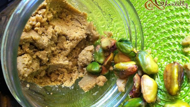 Verser ce sirop sur les pistaches. - 5Mélanger puis laisser tiédir.Mixer avec la poudre d'amandes et l'extrait d'amandes amères pendant au moins 15 à 20 minutes.