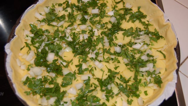 Prenez un moule à tarte haut (environ 3 à 4 cm). Déroulez la pâte à tarte dans le moule (sur son papier sulfurisé). Disposez une couche de lamelles de pommes de terre pour tapisser le fond du moule.