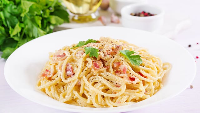 Mélanger la sauce au jambon avec les pâtes et servir aussitôt.