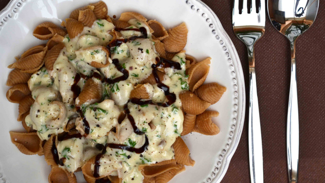 Égouttez délicatement les pâtes et servez immédiatement avec la sauce parmesan et 1 ou 2 traits de crème de balsamique...