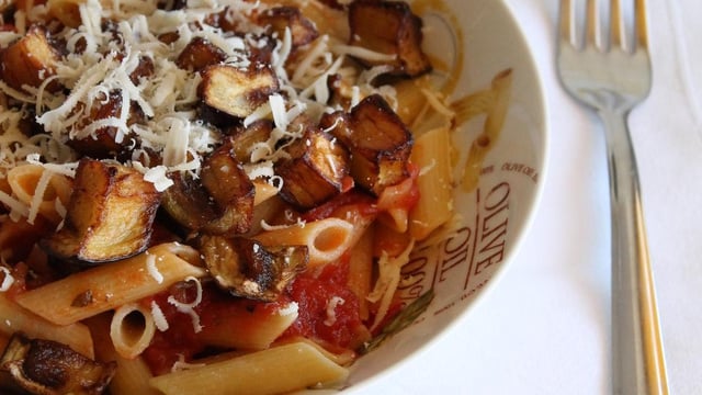 Des superbes pâtes à la sauce tomate et aubergine, typique de la Sicile.