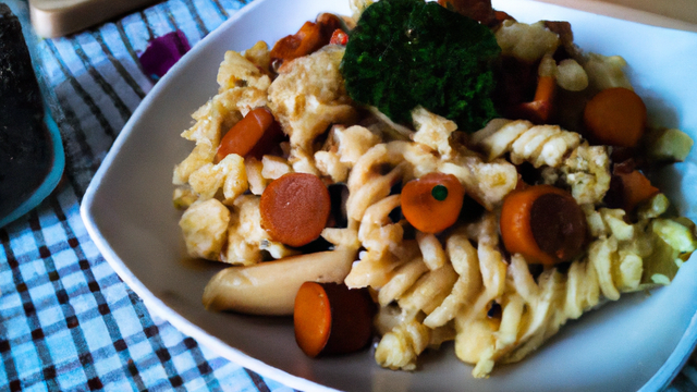 - -Cuire les pates.-Pendant ce temps là, faire revenir dans le beurre le poivron et l'oignon émincés puis ajouter les lardons les saucisses coupés en petits bouts et les champignons saler et poivrer puis déglacer au vin blanc et ajouter la crème fraiche.-Egoutter les pates et servir le tout chaud.