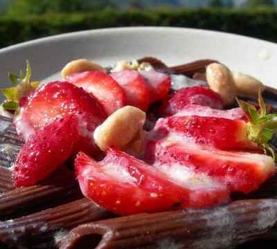 Pendant ce temps, déposez des pâtes dans une assiette, disposez deux fraises coupées en lamelles sur les pâtes et nappez de coulis au nougat. Servez de suite.
