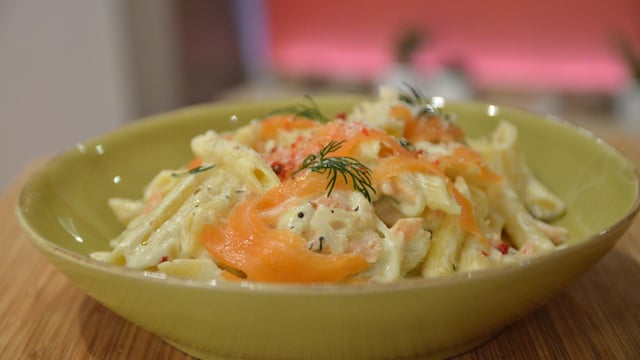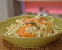 Ajoutez ensuite les pâtes, le saumon fumé coupé en lanières et mélangez bien.