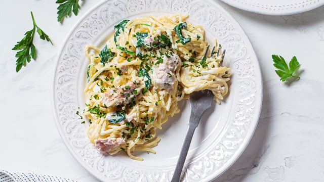 De succulentes pâtes au thon enrobés de crème fraîche et un arôme de thym