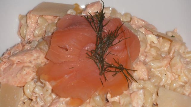 Coquillettes nappées d'une délicieuse sauces citronnée et accompagnée de saumon frais et fumé.