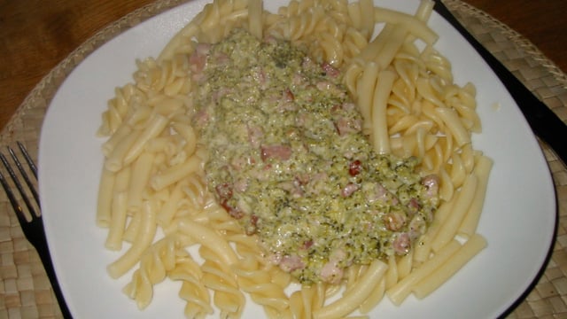 Lorsque tout est cuit ou chaud, mélanger les brocolis et les lardons ; ajouter de la crème fraîche et du parmesan.