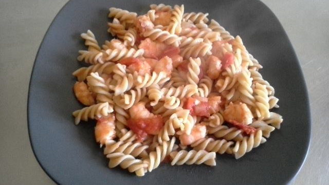 Une fois vos pâtes cuitent mélangez y votre préparation de légumes et crevettes, un peu de fleur de sel et du poivre du moulin.