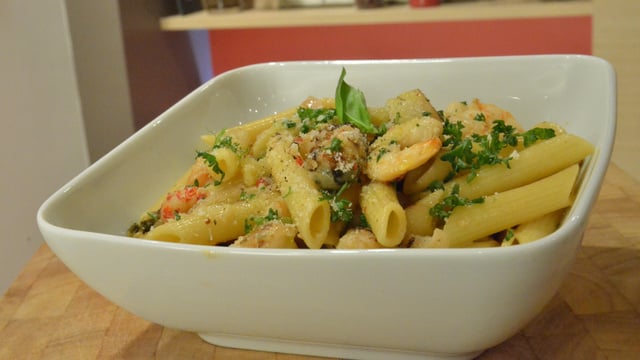 Quand le fumet est de bonne consistance ajoutez la crème liquide et laissez mijoter le tout quelques minutes à feu doux. Ajoutez les pâtes et bien les enrober de la sauce aux fruits de mer.