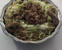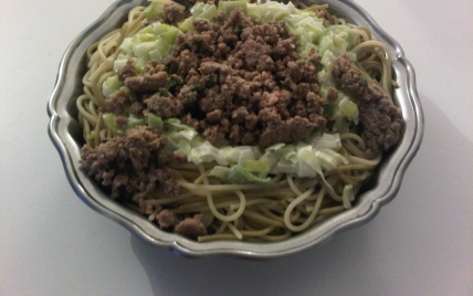 Égoutter les spaghettis, les verser dans un plat et y ajouter, une fois cuit, les poireaux et la crème. Puis incorporer la viande hachée et mélanger le tout.