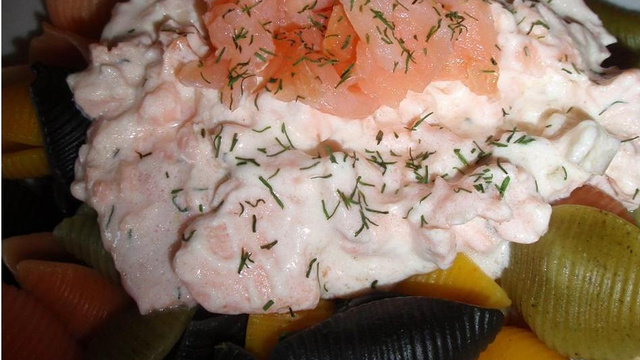 Déglacer avec le vin blanc et laisser réduire. Ajouter la crème et le saumon fumé. Parsemer d'aneth, saler légèrement et poivrer. Egoutter les pâtes, les disposer dans une assiette et ajouter sur le dessus la préparation au saumon en ajoutant éventuellement quelques lamelles de saumon fumé.
