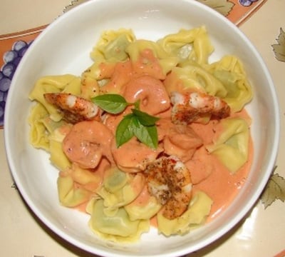 Pâtes aux scampis accompagnées d'une sauce crème fraîche et concentré de sauce tomate.