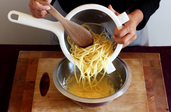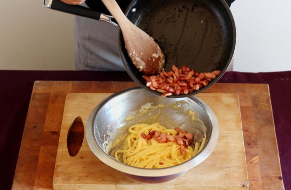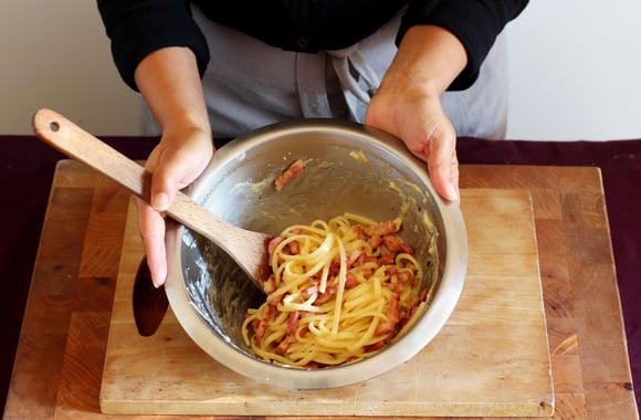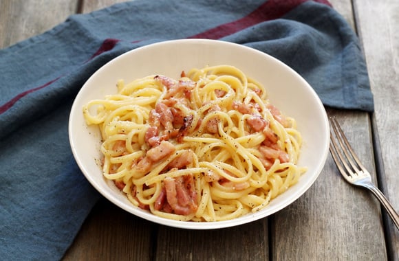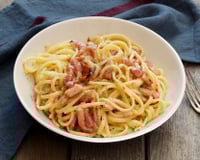 Aujourd'hui, nous vous proposons de préparer des pâtes à la sauce carbonara. Simples à faire, mais aussi faciles à réchauffer au micro-ondes, on ne s'en lasse pas. Après avoir tranché sur l'utilisation des spaghetti ou des rigatonis, on oublie la crème fraiche. Par contre, on bat les œufs directement avec le parmesan râpé. Si vous en avez, vous pouvez mélanger avec un peu de pecorino. Lors de l'étape de l'égouttage, gardez quelques cuillerées d'eau de cuisson. Avec cette astuce, vous allez lier les pâtes et la sauce carbonara faite à la maison. Pour la garniture, nous avons choisi le guanciale, mais vous pouvez le remplacer par une barquette de lardons. Dès la première bouchée de cette assiette de pâtes carbonara, vous allez avoir la nette impression de voyager en Italie...mais sans avoir pris l'avion.