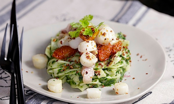 La garniture : Saisissez les pétoncles dans l’huile d’olive. Ajoutez le lard coupé en lanières et les pétales de tomate. Mélangez et laissez sur feu moyen quelques minutes en remuant. Salez légèrement et poivrez. Répartissez les pâtes dans les assiettes, ajoutez la garniture et saupoudrez de copeaux de tomates séchées.